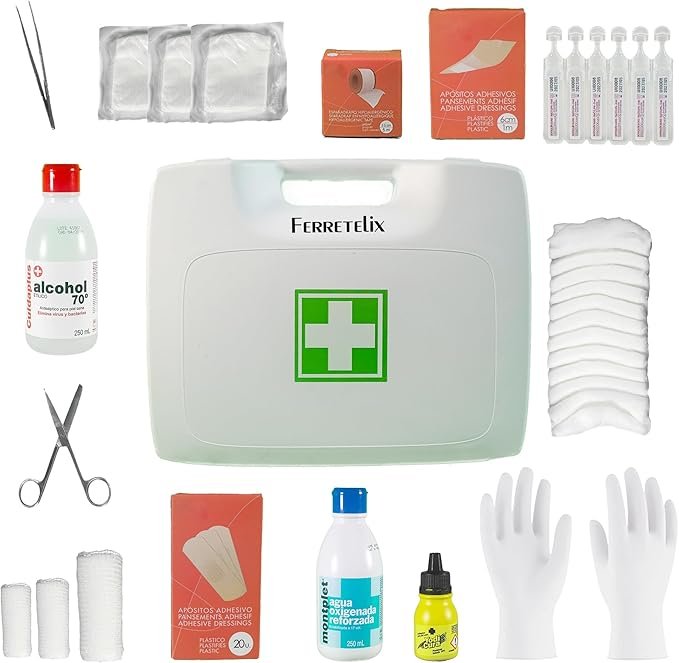 - Dotación Completa de Primeros Auxilios: Incluye todos los suministros esenciales homologados, como vendas, apósitos, tiritas, gasas, tijeras, guantes, soluciones antisépticas y más. Todo lo necesario para responder ante cualquier emergencia.