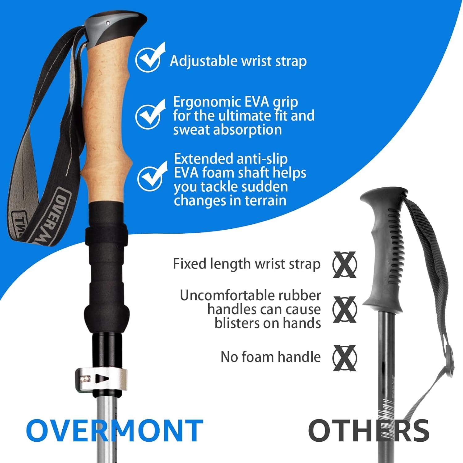 - Agarre ergonómico de EVA: el juego de bastones de senderismo Overmont está diseñado con agarres de EVA que absorben la humedad. Moldeado a la forma de tu mano, resistencia al deslizamiento y absorbe el sudor, más resistente y cómodo que el mango de corcho. Las correas de muñeca son ajustables, pueden permitirte relajar tu agarre ligeramente y transferir parte de la presión a tu brazo.
